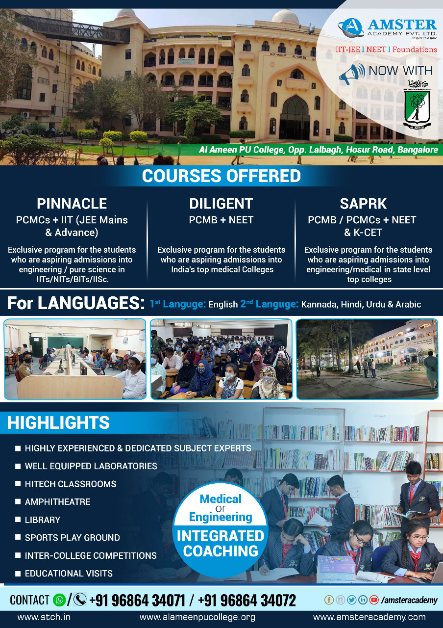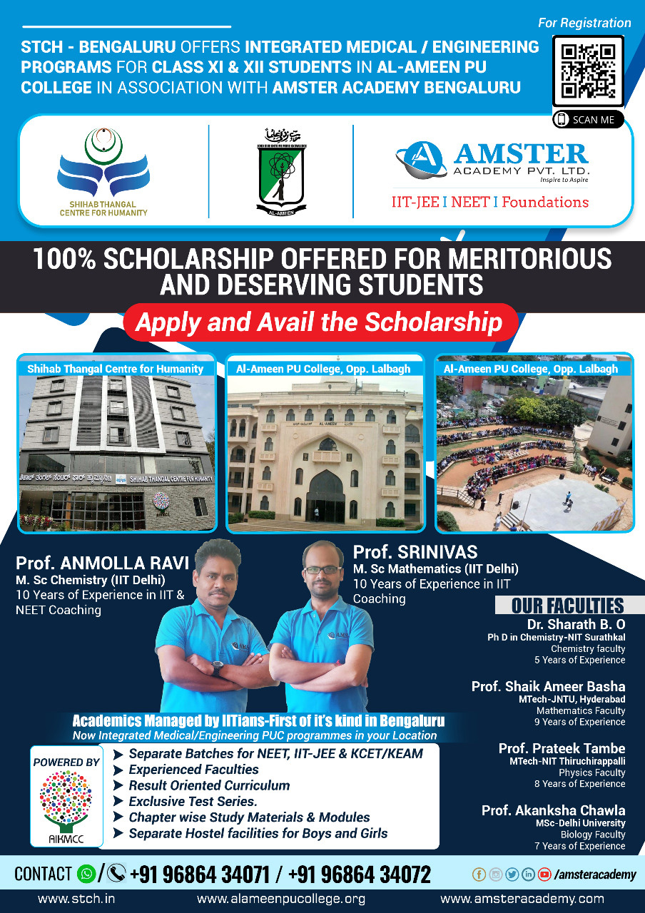 If your answers to all the above questions are in the affirmative, you will be interested to know that the Bangalore-based All India KMCC Shihab Thangal Center for Humanity, in collaboration with Al-Ameen PU college and Amster Academy, is aiming to develop future batches of not only competent and talented, but also of socially responsible and value-oriented technocrats, bureaucrats, engineers, and medical doctors with excellent leadership qualities.